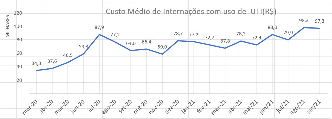 Os custos por internação Covid-19 (UTI), em setembro/20, estavam em R$ 63.966 em média, por paciente. Após um ano, esse número saltou para R$ 97.328, valor 52,2% a mais. Em relação a agosto/21, os valores de setembro/21 se mostram estáveis, porém, a estabilidade se dá em níveis muito altos.