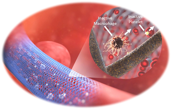 À esquerda, aneurisma cerebral; à direita, imagens de microscopia de fluorescência (coluna à esquerda; plaquetas são representadas em vermelho) e imagens de microscopia eletrônica de varredura do Desviador de Fluxo sem revestimento (imagem superior) e com revestimento HEAL (imagem inferior) após contato com o sangue por uma hora