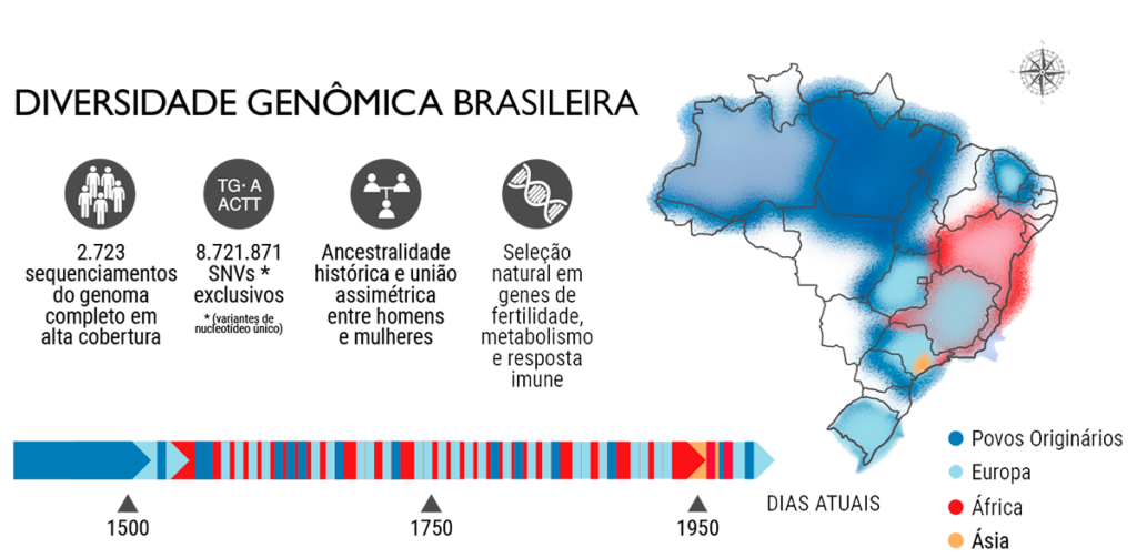 O estudo apresenta uma análise detalhada do DNA de 2.723 brasileiros e brasileiras, representantes de diversas etnias e regiões geográficas, que tiveram seus genomas sequenciados em alta definição nos últimos anos. Os resultados incluem a detecção de quase nove milhões de variantes genéticas inéditas, nunca antes identificadas em nenhuma outra população do mundo, que podem ser de interesse para pesquisas biomédicas e farmacêuticas “customizadas” para a população brasileira. Também jogam luz sobre a herança genética de eventos traumáticos da história nacional, como a escravidão (que trouxe milhões de negros africanos à força para o Brasil) e o extermínio de povos originários (que tiveram sua população reduzida em mais de 80% desde o início da colonização europeia).