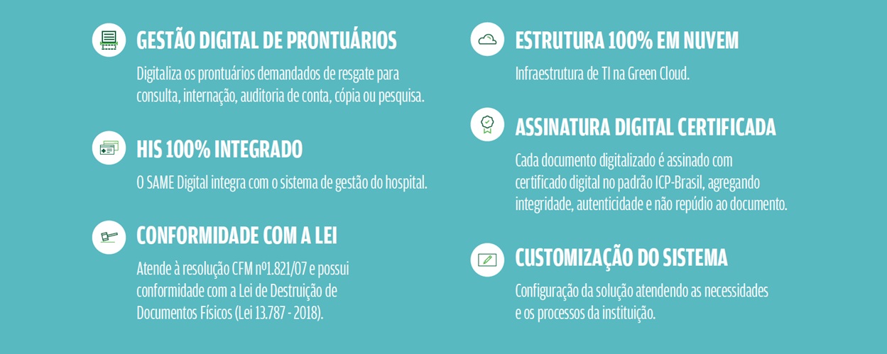 O sistema armazena os documentos em nuvem, indexando as informações para permitir acesso rápido e automatizado, que pode ser integrado ao sistema de gestão do hospital (HIS). Todos os documentos digitalizados recebem uma assinatura com certificado digital (padrão ICP-Brasil) para assegurar sua autenticidade e integridade, cumprindo as normas legais para a eliminação dos documentos físicos originais.