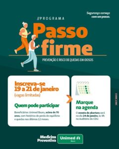 Assim, com o objetivo de promover a melhoria da qualidade de vida, o fortalecimento físico e o cuidado integral de idosos com alto risco de quedas, a Unimed Bauru inaugura, no dia 24 de janeiro, o Programa Passo Firme. A iniciativa oferece treinamento físico individualizado aliado a acompanhamento nutricional e psicológico.