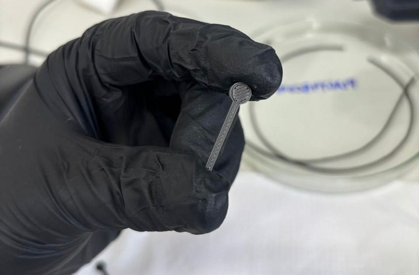 Apesar de existirem filamentos condutores comerciais, a equipe decidiu criar o próprio material para conseguir controlar suas propriedades de forma precisa, adequando-o à produção do sensor desejado. O filamento desenvolvido é de baixo custo e composto por três componentes principais: um biopolímero, grafite e óleo de rícino. Cada componente tem uma função específica: o PLA dá forma e estrutura, o grafite permite a condutividade elétrica e o óleo evita que o material fique quebradiço.