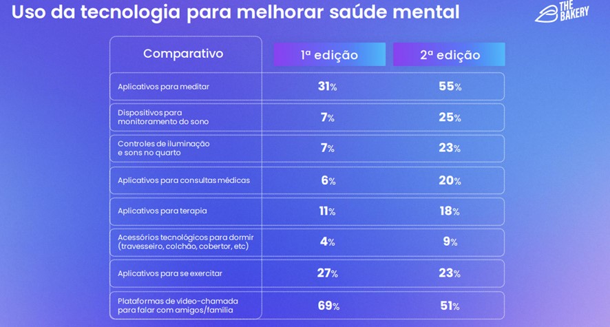 Dos 110 respondentes que disseram utilizar uma ou mais tecnologias para lidar com o sono e a saúde mental, 60% têm entre 18 e 34 anos. A pesquisa revelou ainda que homens e mulheres utilizam essas tecnologias de formas distintas. Enquanto eles usam mais dispositivos para monitoramento do sono e controles de iluminação e sons no quarto, elas recorrem a aplicativos para consultas médicas e plataformas para novos estudos. Os pontos em comum são os aplicativos para meditar e as plataformas de videochamada para falar com amigos e família.