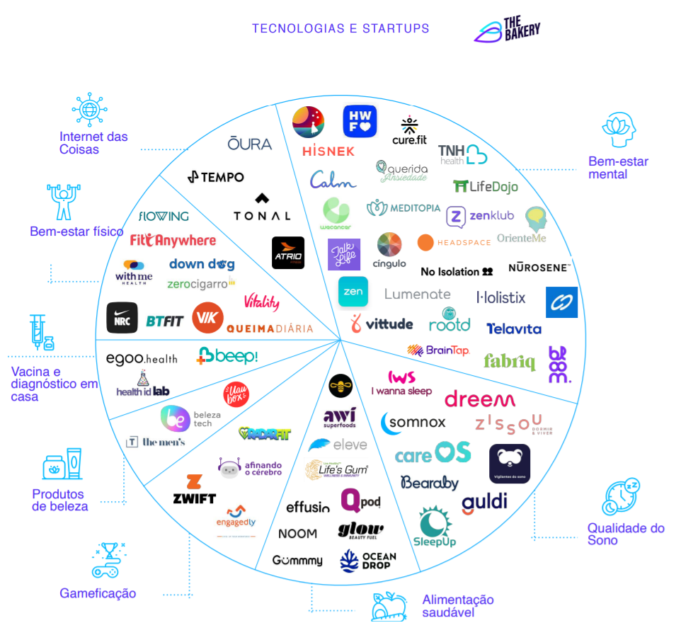 Além de mostrar a evolução das rotinas dos brasileiros, da qualidade do sono e das relações pessoais e de trabalho, o relatório traz ainda um mapeamento de 70 startups nacionais e internacionais divididas em 8 categorias: bem-estar físico, bem-estar mental, qualidade do sono, vacina e diagnóstico em casa, alimentação saudável, cuidados de beleza, gamificação e IoT.