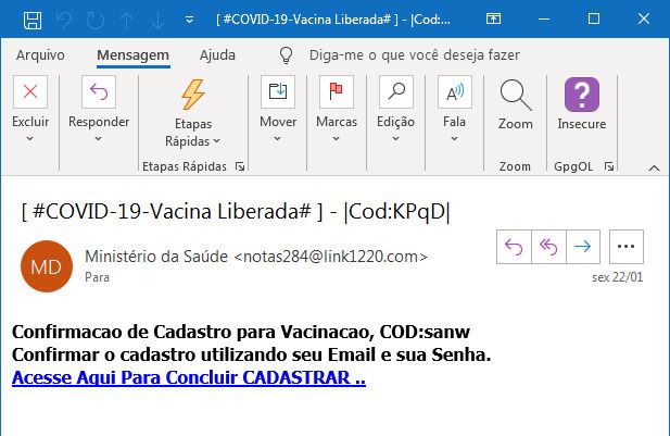 No Brasil, por exemplo, usuários corporativos receberam e-mails falsos convidando para um suposto agendamento da vacinação, tendo como primeiro passo confirmar o interesse por meio de um link. O e-mail redirecionava os usuários para um formulário onde era necessário preenchê-lo com dados pessoais e senhas. Como resultado, as informações pessoais das vítimas acabaram entregues aos golpistas.